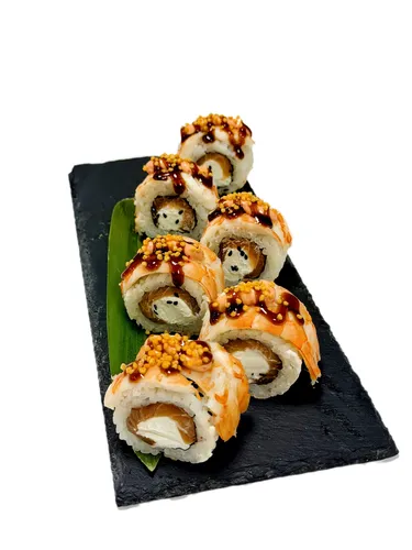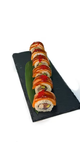 Состав: рис, тунец холодного копчения, креветка тигровая отварная, авокадо, лосось слабой соли, икра масаго, соус спайси , соус чили.