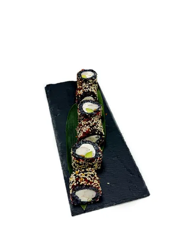 Рис, авокадо, креветка отварная тигровая, пищевой краситель, икра масаго, острый кунжут,