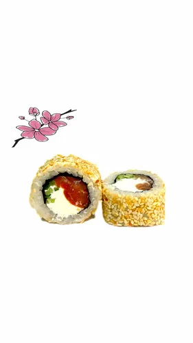 Состав: рис для суши, нори, тигровая креветка в темпуре. огурец, соус спайси, опаленный лосось с/с, кунжут.