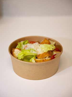 Состав : салат айсберг, сухарики, Сыр чеддер Ольденбург, соус сметанно-чесночный, наггетсы, помидор.
