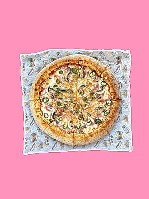 Состав: натуральный сыр моцарелла, томатный соус, обжаренный говяжий фарш, лук салатный-маринованный, перчики халопеньо  и шампиньон.