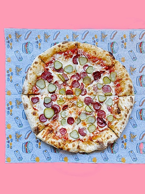 Состав: натуральный сыр моцарелла, соус томатный, колбаски охотничьи, огурчик маринованный.