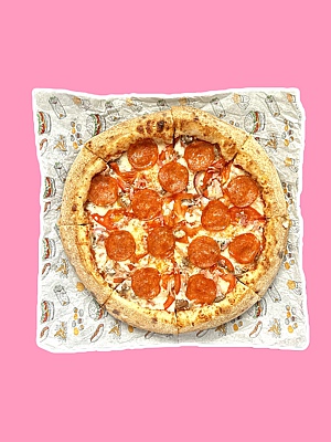 Состав: томатная основа, натуральный сыр моцарелла, фарш говяжий, колбаски пепперони, копченная грудинка, маринованный салатный лук и свежий помидор.