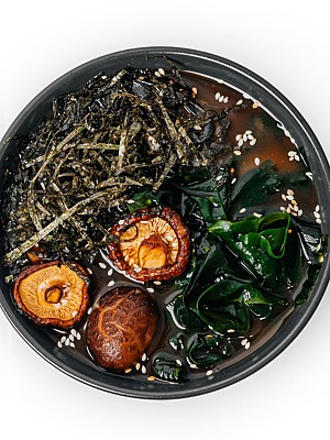 Бульон мисо, водоросли вакаме, водоросли нори, грибы шиитаке, кунжут.