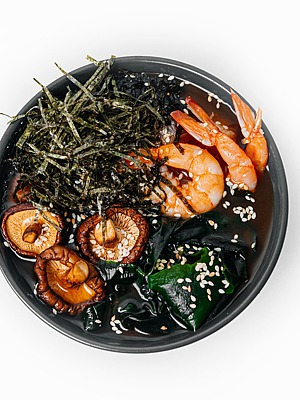 Бульон мисо ,тигровые креветки ,водоросли вакаме ,водоросли нори , грибы шиитаке ,кунжут.