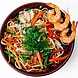 Тигровые креветки ,чеснок ,перец болгарский ,морковь ,лук репчатый ,фасоль стручковая , фирменный соус Сакура, зелень .