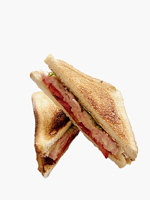 Состав : хлеб тостовый, соус сливочный, помидор свежий, ветчина, натуральный  сыр моцарелла, лист салата.