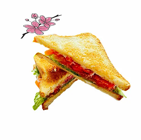 Состав : хлеб тостовый, соус сливочный, помидор свежий, грудка куриная подкопченная,натуральный сыр моцарелла, лист салата.